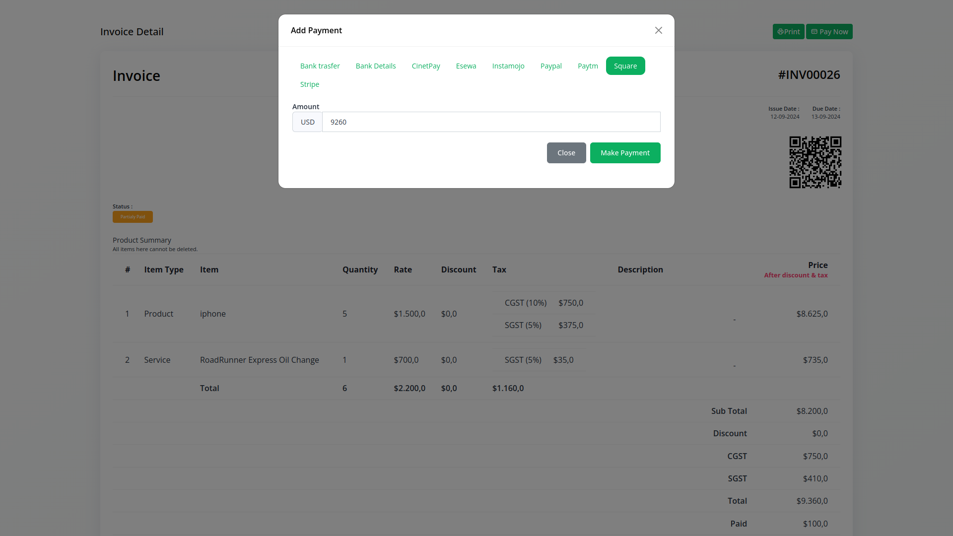 Optimize your payment process with the capability to generate electronic invoices (both retainer and sales), facilitate plan payments, ensure secure delivery, and enable easy payment initiation and authorization through the Square Payment platform. By incorporating Square Payments into Dash SAAS, you can simplify and secure your payment processes, providing a smooth experience for both your business and your customers.